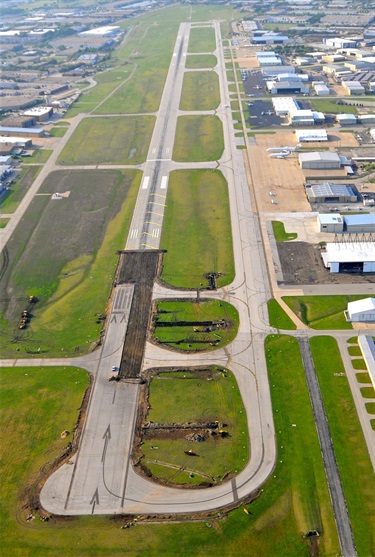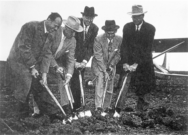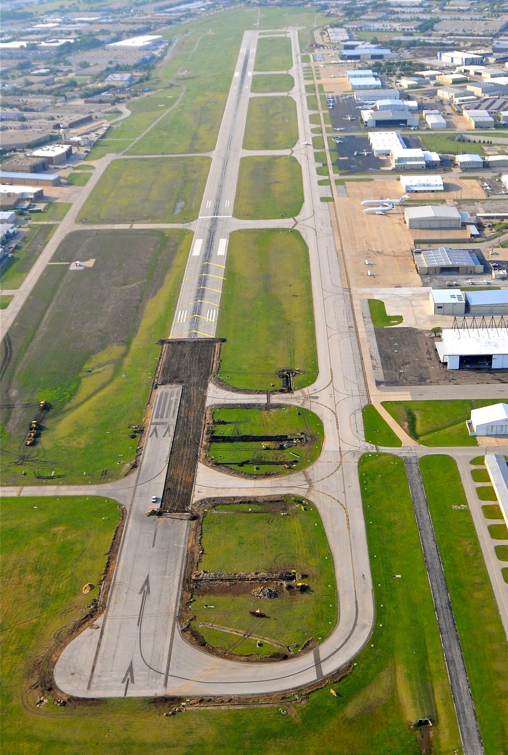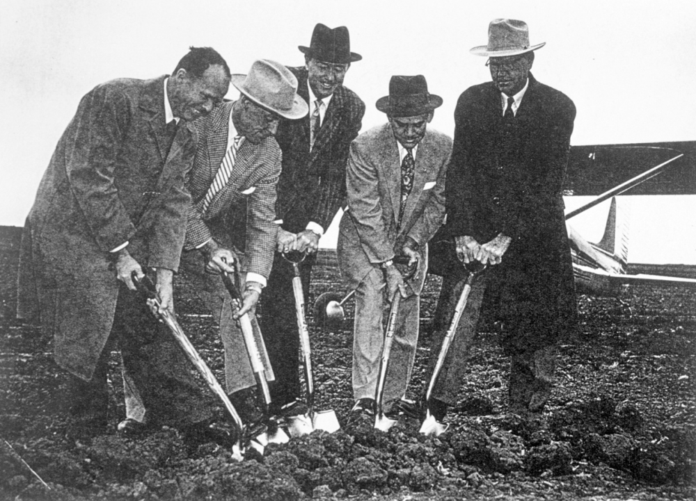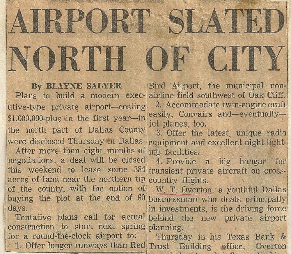 Addison Airport was established in 1957 by a group of Dallas businessmen led by John Murchison and W.T. “Bill” Overton. These two men, along with Toddie Lee Wynn, Jr., James I. DeLoache, and W.D. DeSanders, served as the original Directors of Addison Airport, Inc., the private corporation formed to develop the new airport. Groundbreaking ceremonies for the $2,291,000 project – financed entirely with private funds – were held on March 16, 1957. The original airport featured a 4,500-foot long by 100-foot wide asphalt runway (Runway 15-33) and a 3,200-foot long by 200-foot wide packed turf crosswind runway (Runway 3-21) on a 400-acre site in the largely undeveloped northern suburbs of Dallas.
